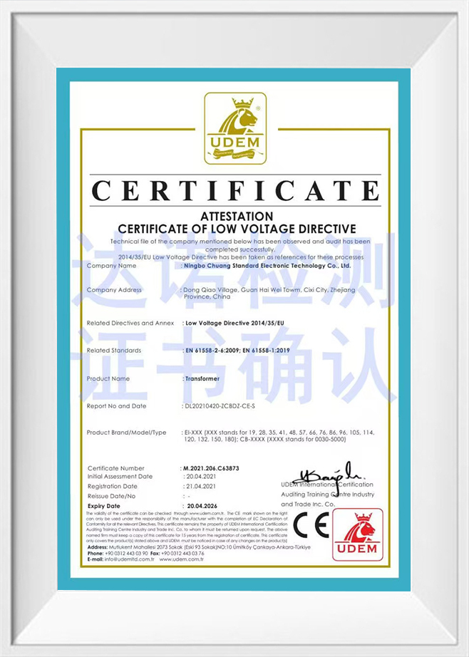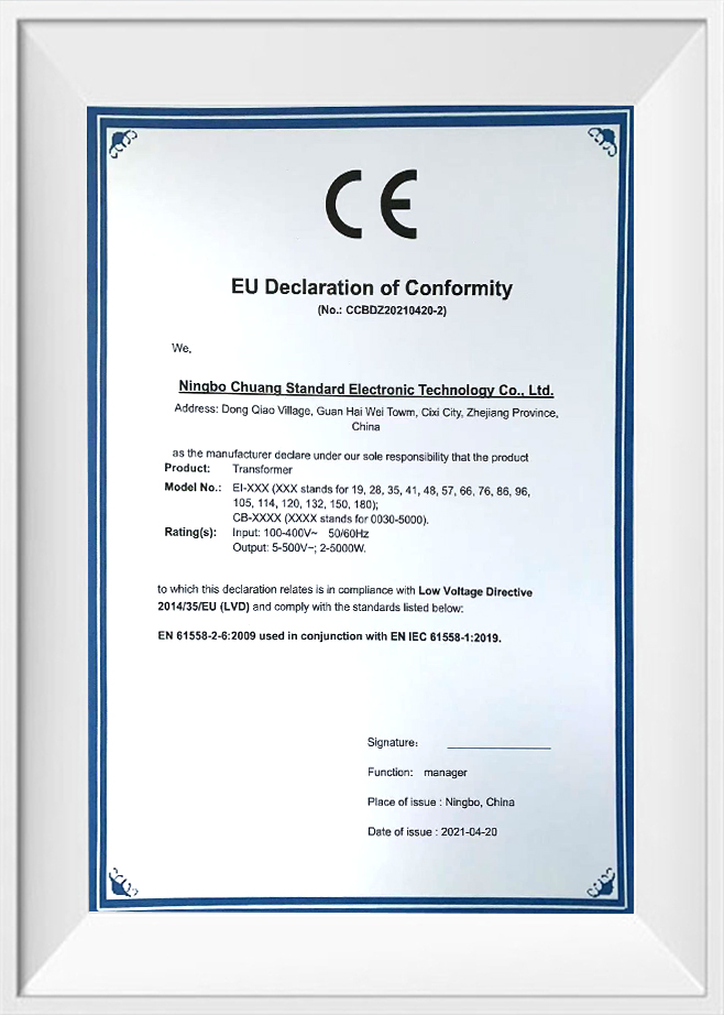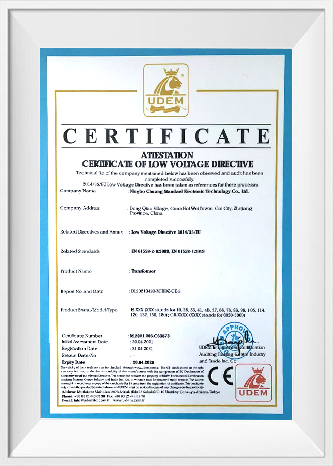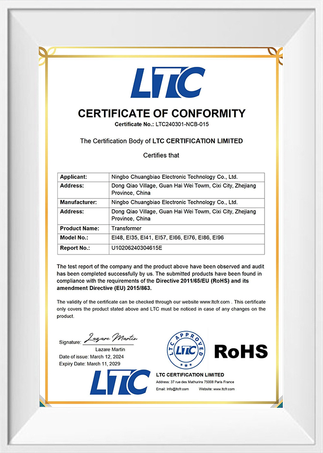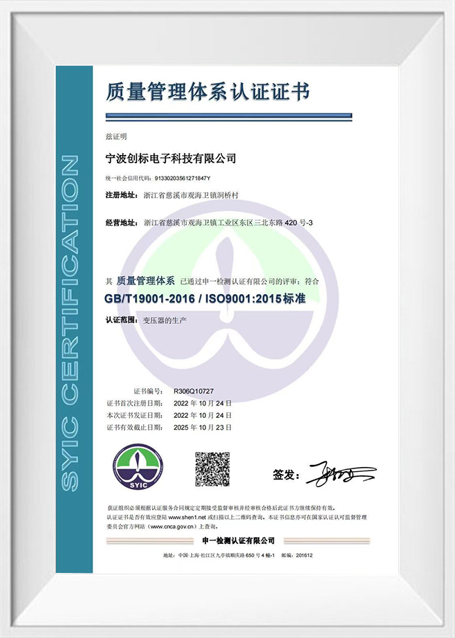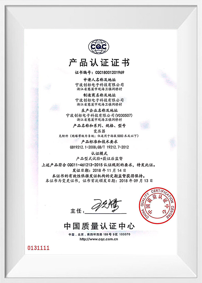 Ningbo Chuangbiao Electronic Technology Co., Ltd. Følger Strengt Kravene I ISO 9001 KValitetsStyringSystem for at Kontrollerere KValiten I Processen Med hos Producere R-Type Transformer, Vilet Sikrer, at Hver Transformer Gennemgår Streng Kvalitetsinspebtion OGTEPTING. Virksomheden Har Også Bestået Cqc -ProduktkValitetsCertificering OG Rohs Miljøcertificering til på Sikre, på Produkkerte Overolder International Miljøregler, Bruger Ufarlig Materialerer OG BEKTERTTER MORJØET.